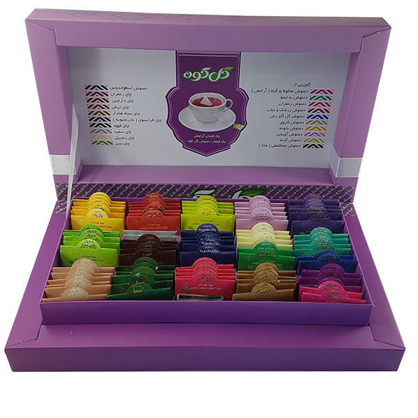 ترکیبات: گل گاوزبان/ نعنا فلفلی / زرشک و عناب /کاروی/آویشن /گزنه/بابونه /به لیمو/ پنج. گیاه/اسطوخودوس /دارچین /ترش/بادرنجبویه/چای سفید/ چای قهوه/چای زنجبیل/چای سبز